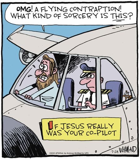 Jesus as a co-pilot sees an airplane and yells “sorcery!” Apparently, nobody briefed him on Boeing. Pure brilliance in one frame.