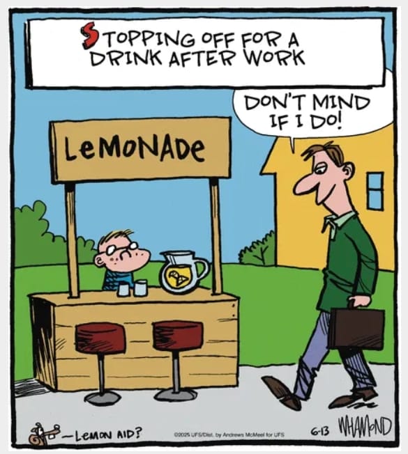 An adult misinterprets a kid’s lemonade stand as a bar. Whether it’s alcohol withdrawal or dad humor—either way, it’s hilarious.