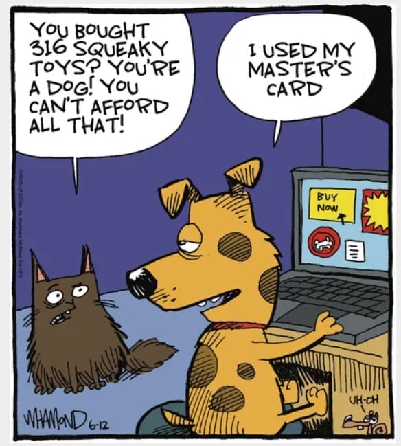 A dog orders 316 squeaky toys online and proudly announce, “I used my master’s card!” It’s adorable… and financially irresponsible.