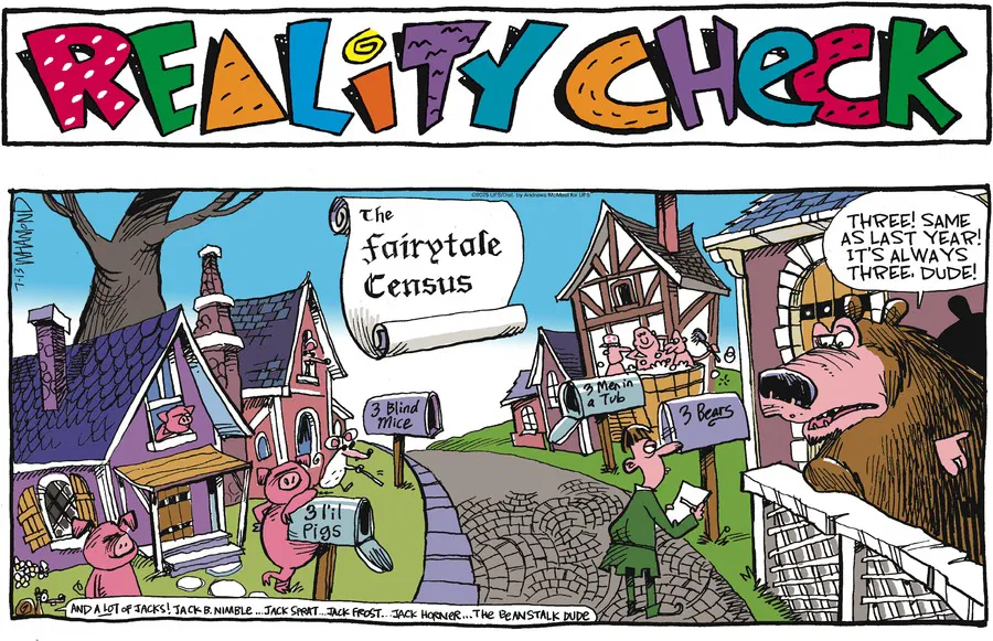 Three blind mice, three bears, three pigs—it’s always three! This double-wide strip parodies census-taking in a fairytale land, with sharp gags for fairy tale fans and number nerds alike.