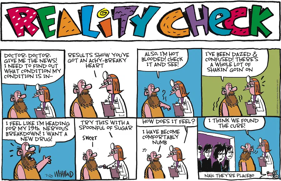 Song lyrics become medical diagnoses in this musical medicine mashup. The final panel’s “placebo” joke is a sweet (and surprisingly smart) closer.