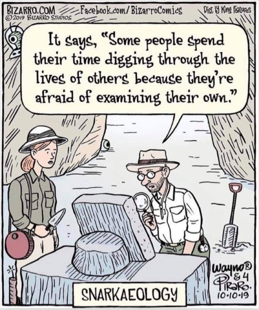 It says, “Some people spend their time digging through the lives of others because they’re afraid of examining their own.”