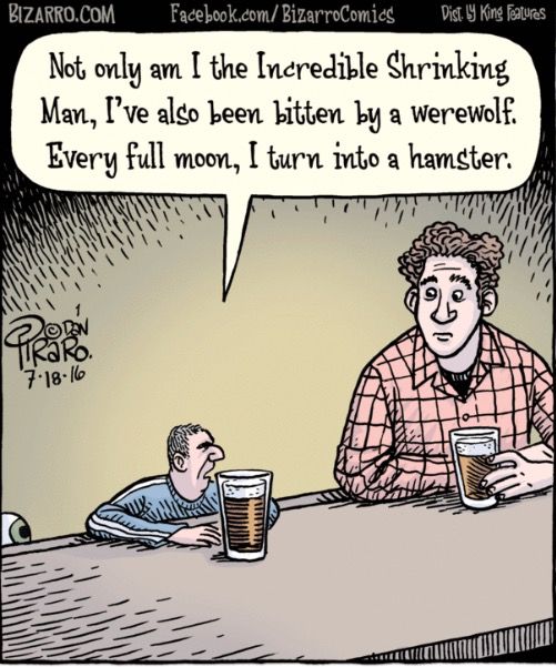 Not only am I the Incredible Shrinking Man, I’ve also been bitten by a werewolf. Every full moon, I turn into a hamster.