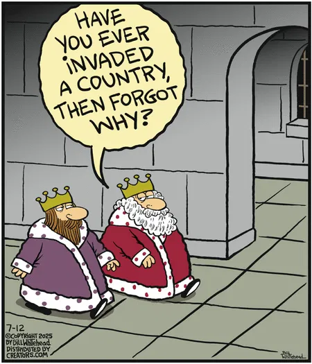 Ever forget why you started a fight? Two kings stroll the castle, trading regrets over forgotten wars. A perfect roast of both politics and absentmindedness.