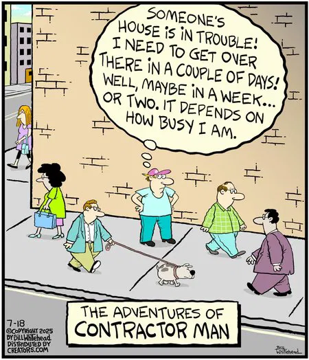Saving homes—eventually! The world’s most relatable superhero will get to your house… whenever. This comic nails the punchline for anyone who’s ever waited for a contractor to show up.