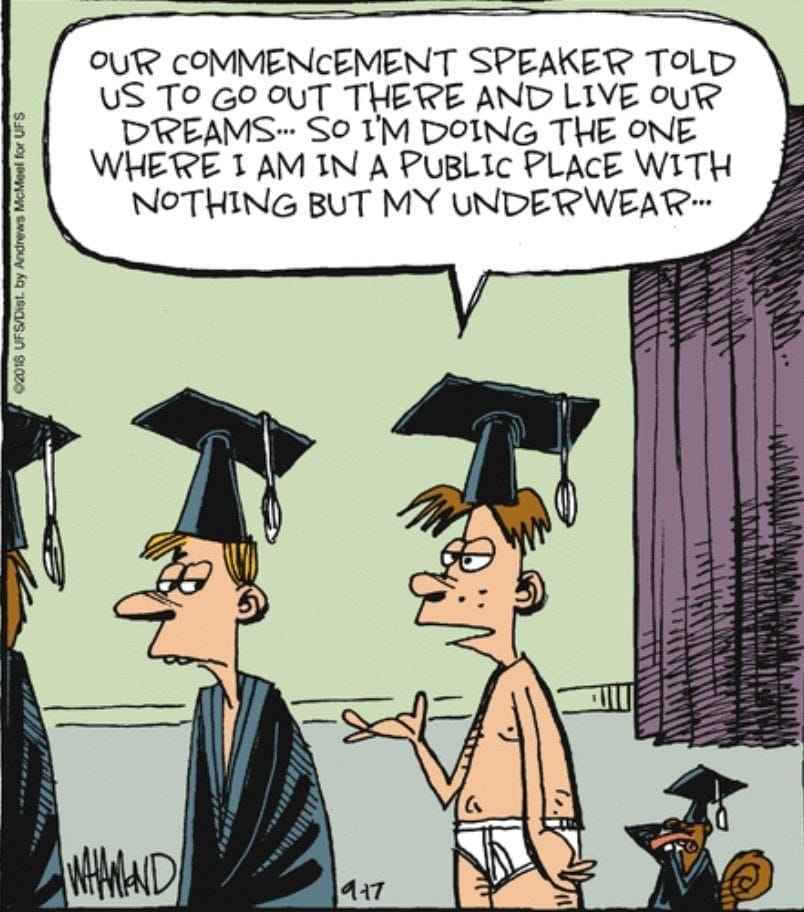 “Live your dreams, they said… so I’m doing the one where I’m in public in just my underwear.” Some commencement speeches hit a little too close to home.