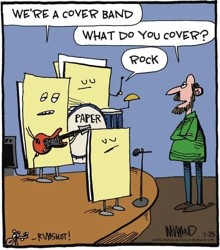Paper covers rock—literally. A cover band that covers rock. This one is for all you pun lovers and dad-joke aficionados. Cue the rimshot.