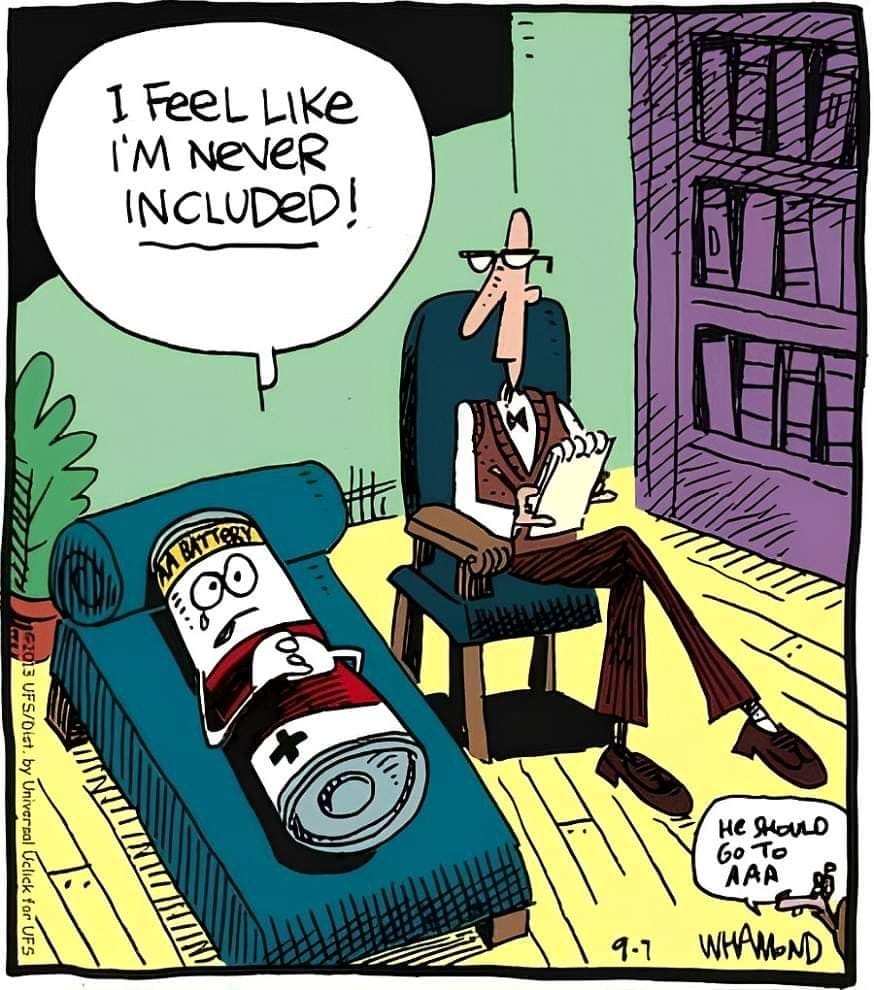 An AA battery on the therapist’s couch: “I feel like I’m never included!” Proof that even batteries need a little positive energy sometimes.
