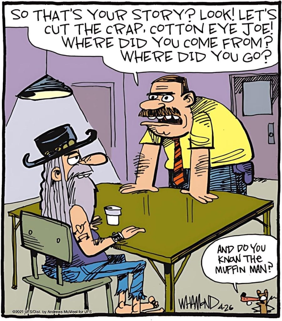 Detective: “Where did you come from, where did you go?” No one escapes the dreaded Cotton Eye Joe questioning—not even the Muffin Man.