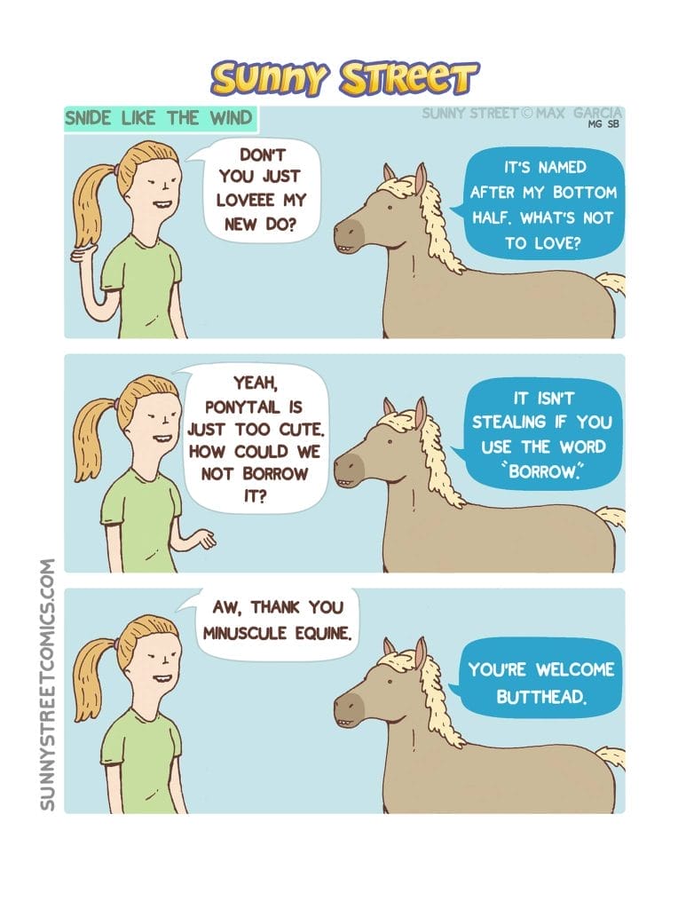 A woman praises her new ponytail hairstyle. The pony responds, “It’s named after my bottom half.” She thanks him. He replies, “You’re welcome, butthead.” It’s silly, sharp, and weirdly wholesome. Garcia once again turns casual convo into chaos.