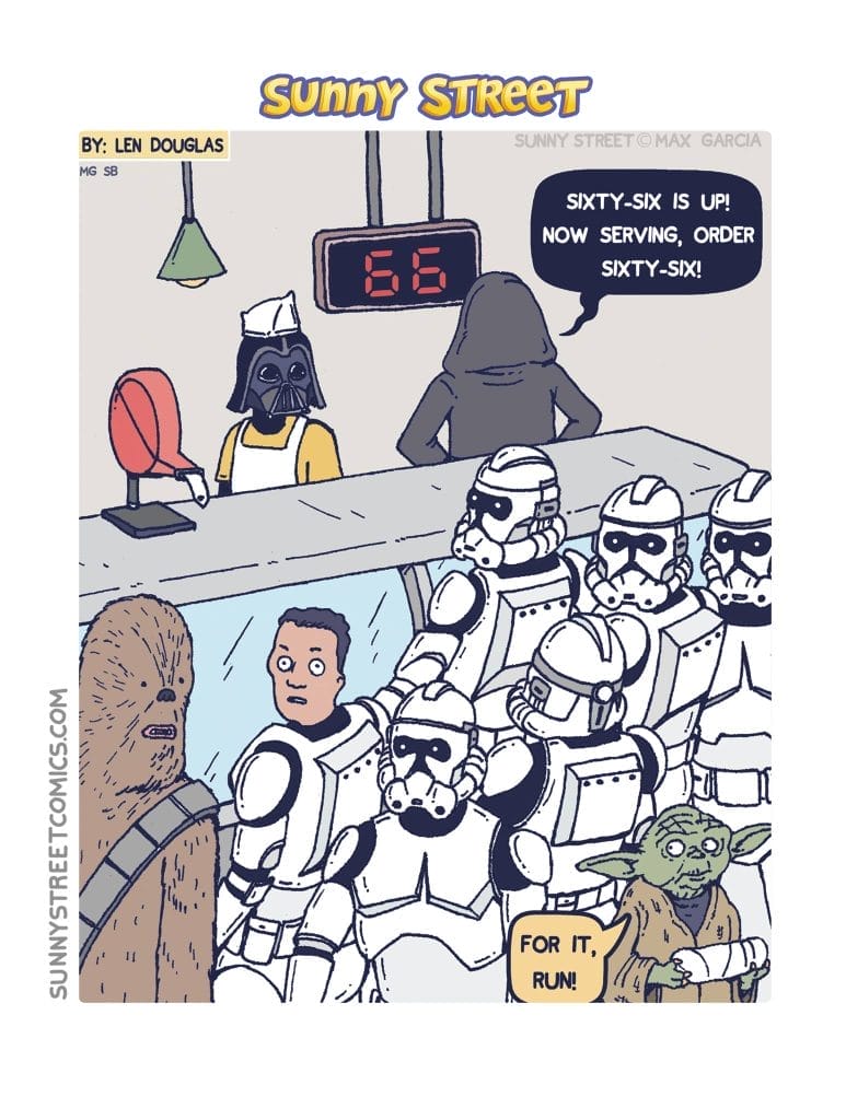 In a fast food Star Wars universe, a worker yells, “Now serving, Order 66!” All the clone troopers lose their minds—and Yoda screams, “For it, run!” This hilarious crossover spoof is geeky gold and a treat for Star Wars fans.