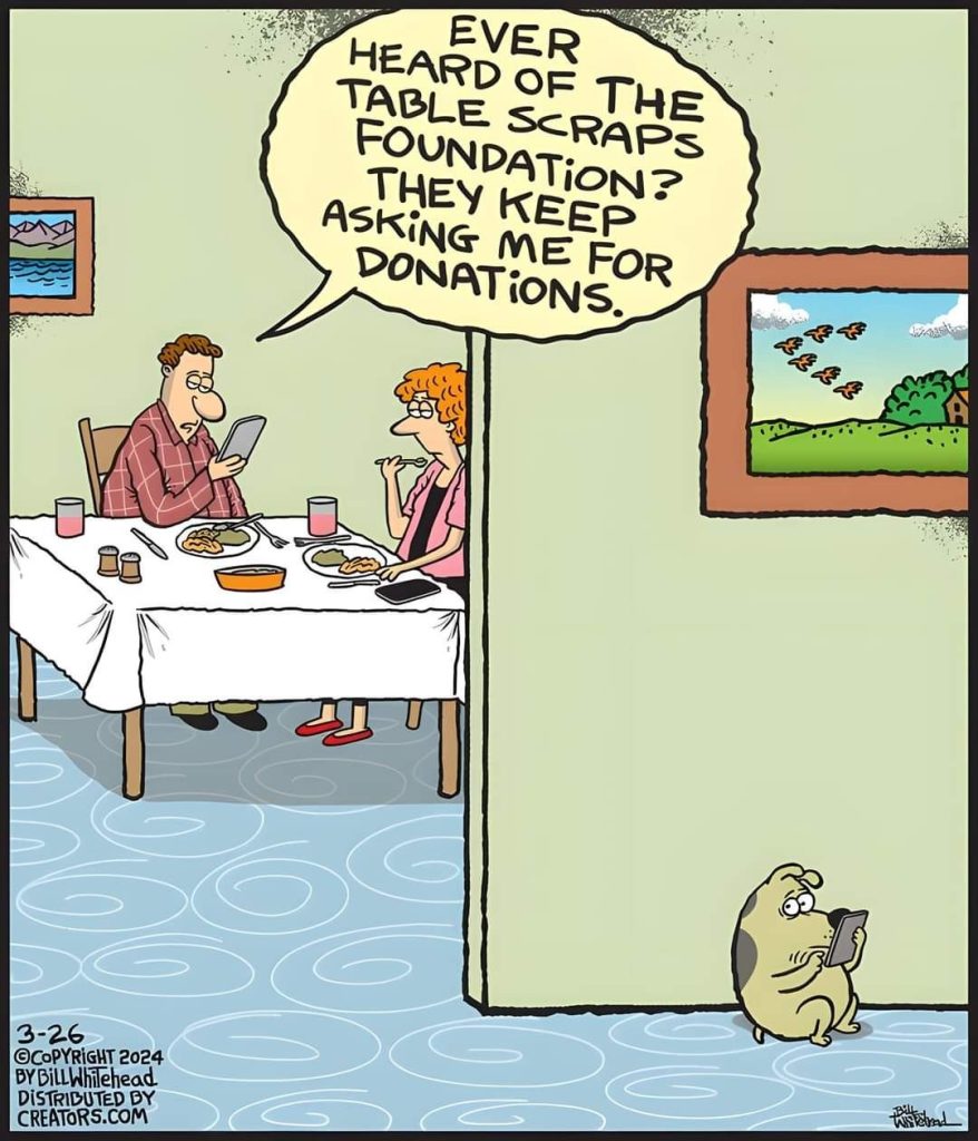 A dog checks his phone, annoyed at constant donation requests from the “Table Scraps Foundation.” The struggle is real.