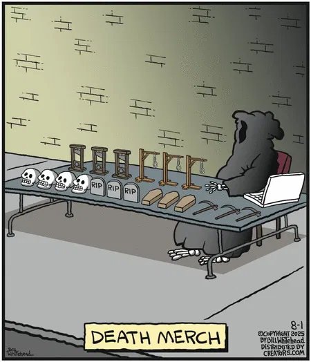The Grim Reaper’s side hustle includes selling skulls, mini coffins, and guillotines. Because even death has overhead costs.