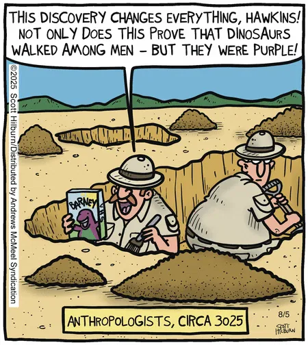 twisted Humor Comics are a wild ride of absurd punchlines, unexpected wordplay, and situations so bizarre they loop back around to genius. In this review, we’re diving into 20 of Scott Hilburn’s laugh-out-loud creations from The Argyle Sweater—a series that proves the weirder the premise, the bigger the laugh. From anthropologists discovering purple dinosaurs to dogs debating “OnlyLegs,” this collection is an all-access pass to Hilburn’s brilliantly offbeat mind.