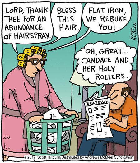 A woman blesses her hair while her husband groans about “holy rollers.” Divine comedy, salon-style.
