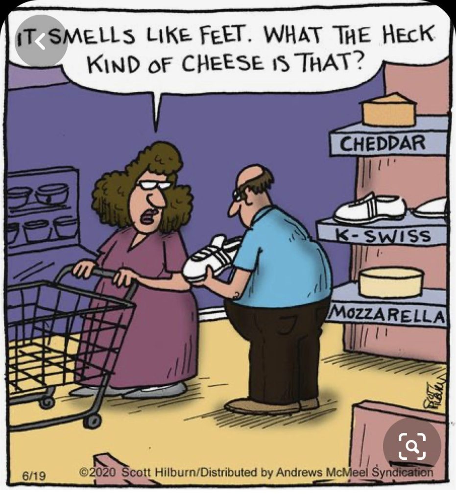 What’s that smell? A grocery shopper can’t tell if her husband’s found a new cheese or just some extra funky sneakers. The punchline is a twisted blend of culinary and athletic confusion.