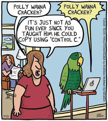 Polly’s learned a new trick—copy-pasting her catchphrases. This comic lampoons both technology and pet parenthood, delivering a punchline that’s as modern as it is mischievous.