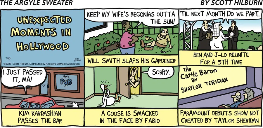From Will Smith slapping a gardener to Kim Kardashian passing the bar, this multi-panel gag throws out headline after headline, each one more twisted than the last. Hollywood, you’ve met your match.