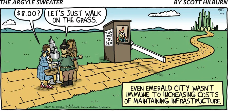 Even Dorothy and friends aren’t safe from rising infrastructure costs in Oz. When the Yellow Brick Road demands an $8 toll, these classic characters opt for a little green grass and some sharp social commentary.