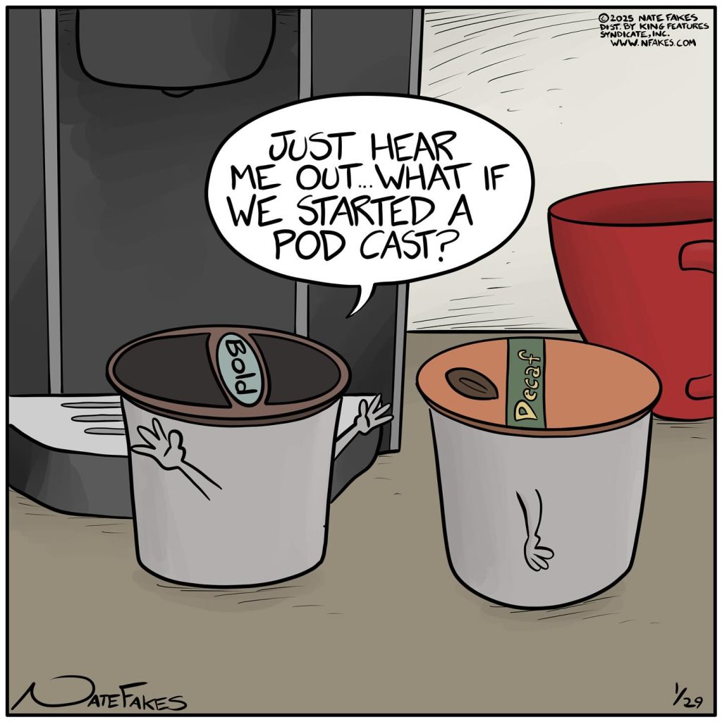 Two coffee pods brainstorm a podcast. The coffee humor is strong with this one, and the meta-pun is exactly what makes Nate Fakes’ viral comic strips internet favorites.