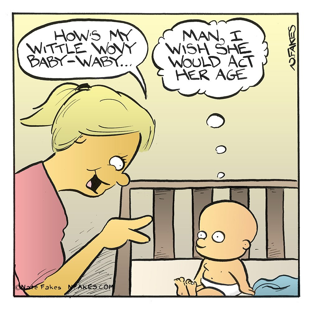 The classic baby talk scenario gets flipped when the baby thinks, “I wish she would act her age.” Fakes shines at these role-reversal moments.