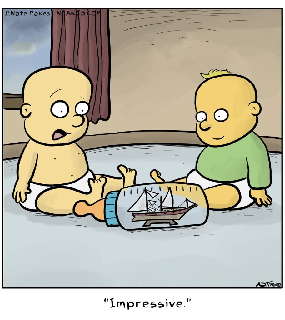 A baby builds a ship in a bottle—with a baby bottle. Absurd and brilliant, it’s the kind of viral comic strip that’s perfect for social sharing.