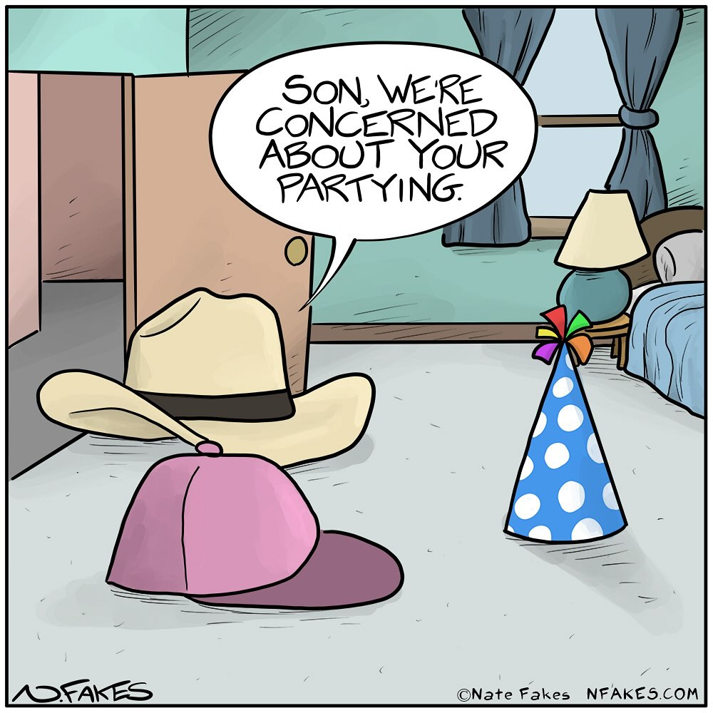 A party hat gets a talking-to from worried parents (cowboy hat and baseball cap). Viral comic strips don’t get much more charming or literal than this.