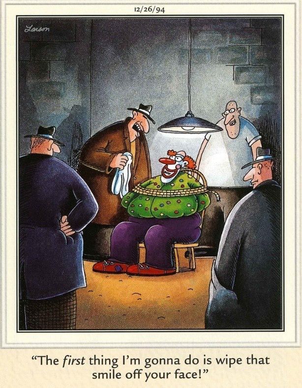 What happens when a clown gets roughed up in a noir-style police lineup? Larson’s blend of hard-boiled drama and circus gags is unmatched. The threat to “wipe that smile off your face” feels both ridiculous and oddly satisfying.