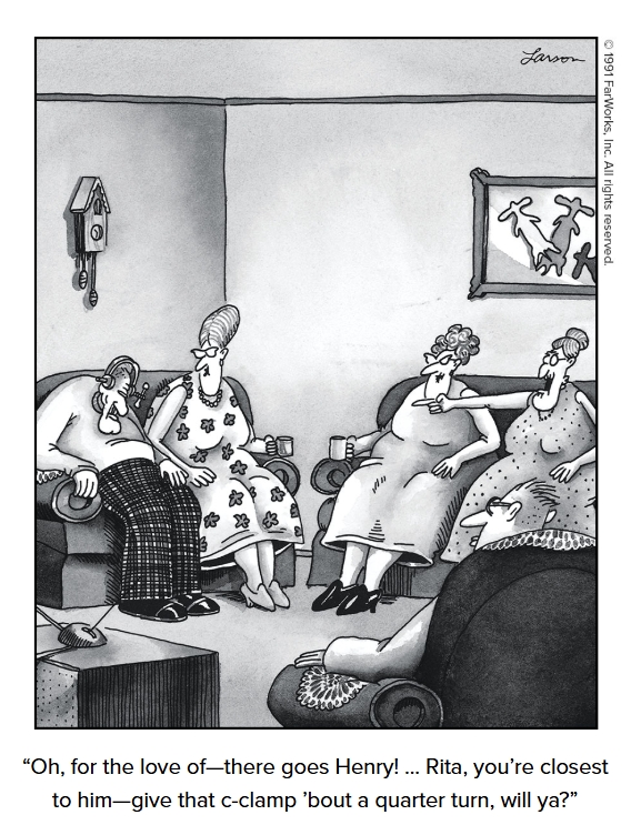 Family gatherings can be awkward—especially when someone needs a mechanical adjustment. The surreal living room scene, complete with a “c-clamp” and a room full of unimpressed ladies, turns family drama into slapstick gold. Larson’s eye for the quietly bizarre shines here.