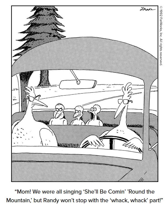 Chickens with attitude, road trip singalongs, and sibling squabbles—this cartoon packs all the classic family car chaos into one beaky package. Larson transforms an old folk song into poultry pandemonium, and you’ll never hear “She’ll Be Comin’ ’Round the Mountain” the same way again.