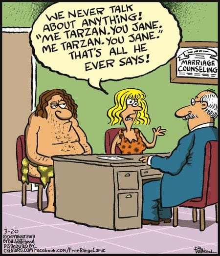 In a couples therapy session, Tarzan gets roasted for having a one-phrase vocabulary. A caveman twist on communication problems with perfect visual delivery.