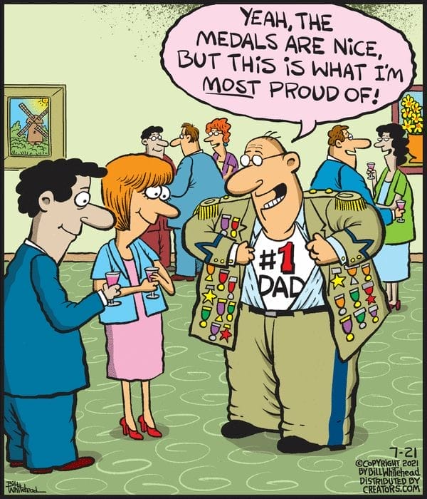 This comic shows a proud dad flashing his #1 Dad shirt under a military jacket filled with medals. Priorities, people! A hilarious reminder that fatherhood is the true battlefield.