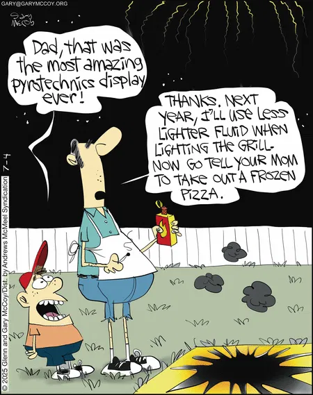 What’s better than fireworks? Accidentally creating a backyard crater, apparently. Dad’s creative (and slightly dangerous) grilling methods make this a standout among witty cartoons.