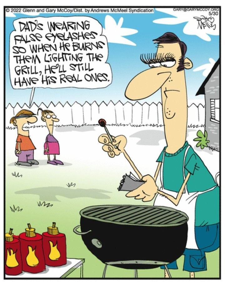 Barbecue season gets a glow-up as dad wears fake eyelashes to save his real ones from the grill. This cartoon is a hilarious tribute to dad logic and a reminder that sometimes the silliest ideas are the smartest.
