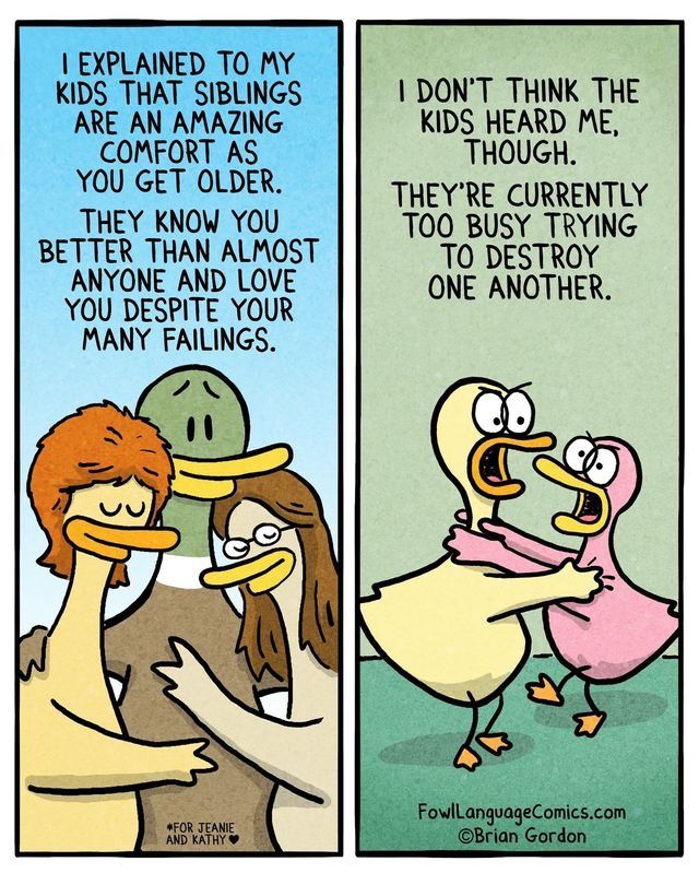 This one hilariously imagines the behind-the-scenes dialogue between bored siblings. “Wanna fight?” one asks, like it’s the most natural thing in the world. “Only if we cry,” comes the reply. It’s classic Fowl Language—raw, real, and laugh-out-loud funny for any parent of multiple kids.