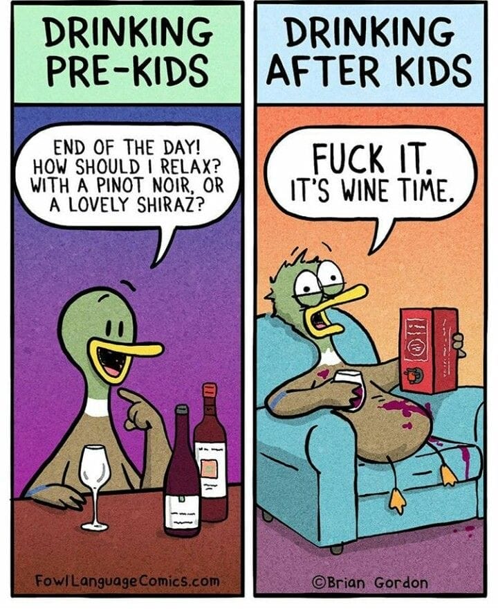 Pre-kids, wine was for pairing with dinner. Post-kids, it’s survival juice. This side-by-side comparison captures the glamorous fall from grace in the funniest way possible. Who needs a wine glass when there’s a box?