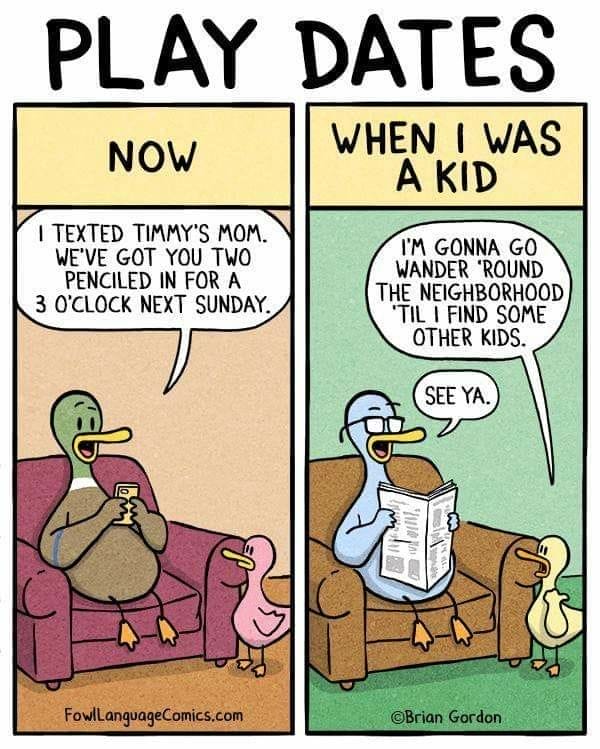 Playdates today are like scheduling a diplomatic summit. Back then? You wandered the neighborhood and hoped for the best. This comic nails the shift in parenting culture with sharp wit and nostalgia.