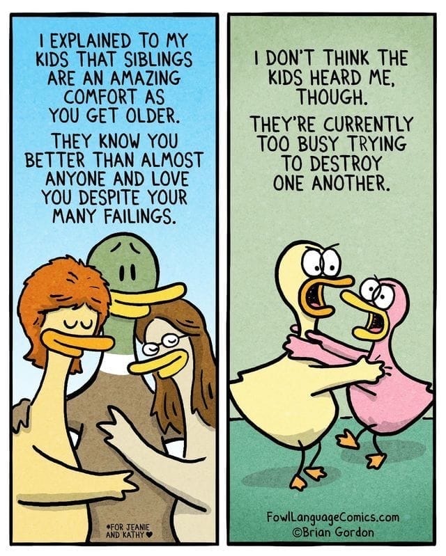 This one hilariously imagines the behind-the-scenes dialogue between bored siblings. “Wanna fight?” one asks, like it’s the most natural thing in the world. “Only if we cry,” comes the reply. It’s classic Fowl Language—raw, real, and laugh-out-loud funny for any parent of multiple kids.