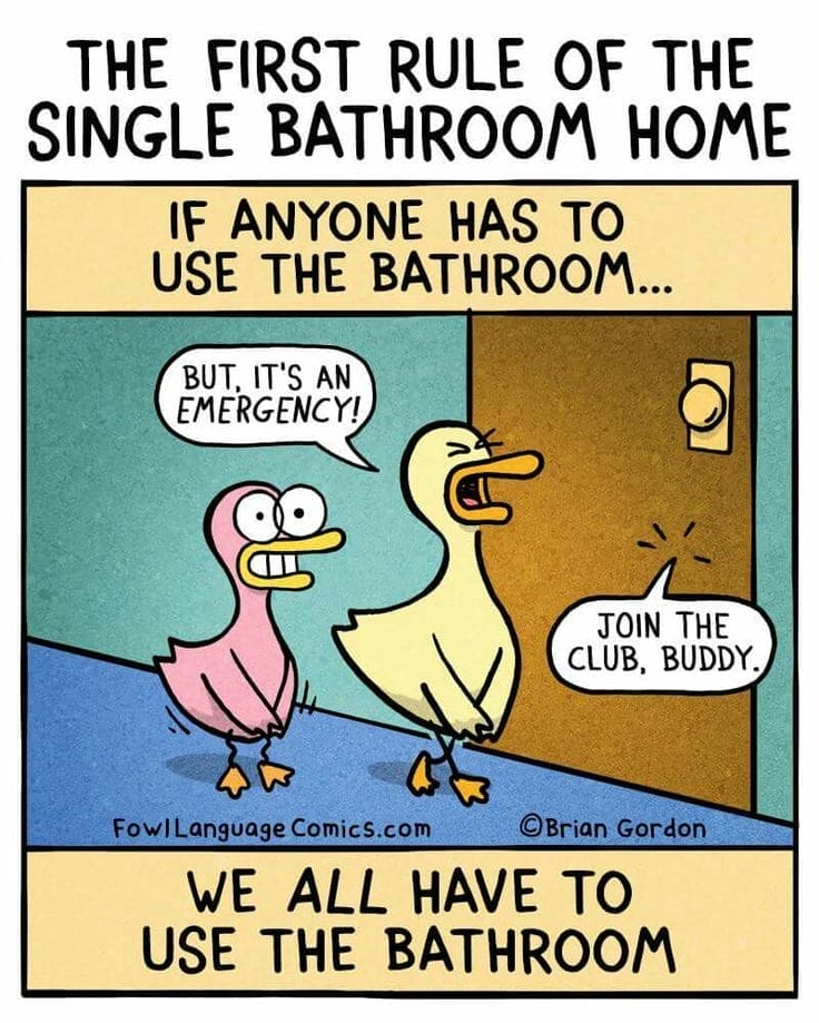There’s an emergency—but it doesn’t matter. When your house has one bathroom, it becomes survival of the fastest. Fowl Language uses the smallest room in the house for one of its biggest laughs.