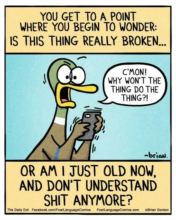 This comic dives into a universal modern crisis: Is the device broken, or have you become too old to understand it? That moment of techno-confusion is hilariously real, especially for parents trying to stay relevant.