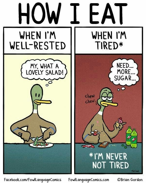 How you eat depends entirely on your energy levels. Well-rested you makes healthy choices. Tired you? You become a sugar-gobbling raccoon. It’s a hilarious insight into self-control (or lack thereof) from a perpetually sleep-deprived parent.