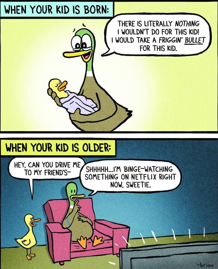 You’d do anything for your newborn—take a bullet, climb mountains, go without sleep. Fast forward a few years, and you’re too lazy to drive them to a friend’s house. This comic brilliantly contrasts new parent enthusiasm with seasoned parent exhaustion.