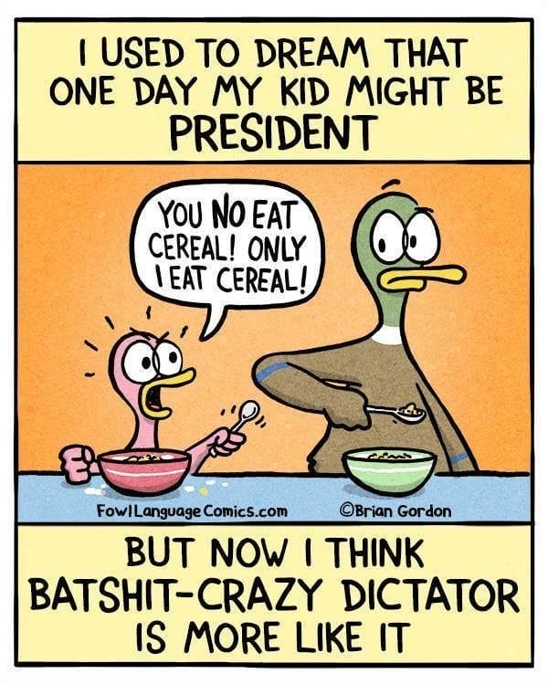 Dreams of your kid growing up to be a noble leader are crushed by breakfast-time tyranny. “Only I eat cereal!” screams the pint-sized tyrant. It’s a wonderfully absurd comic that mirrors real-life power struggles over the most trivial things.
