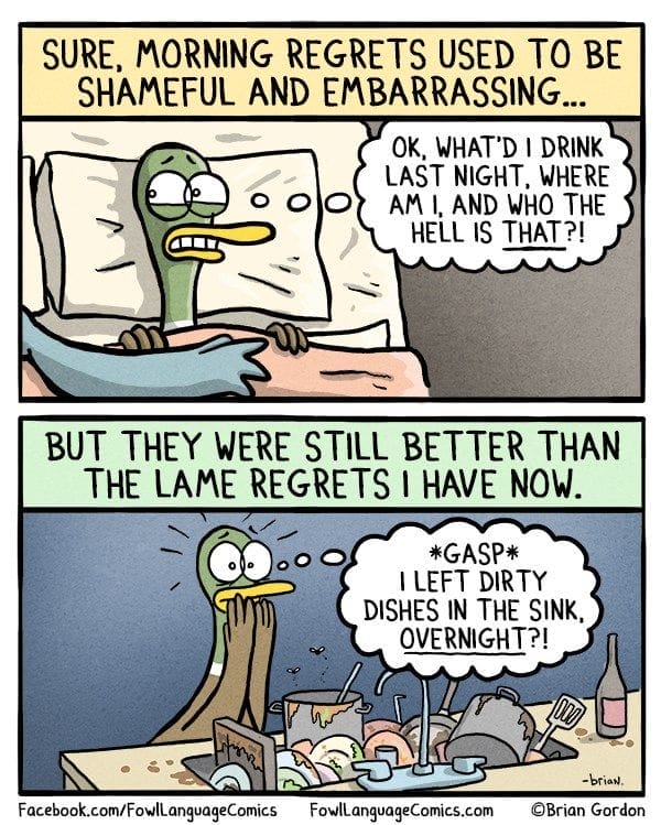 Once upon a time, you woke up regretting parties and bad decisions. Now, it’s the dishes you forgot to clean. This comic wraps it up with a punchline that’s as sad as it is funny—because it’s true.