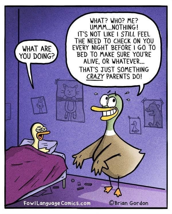 The dad duck gets caught doing a late-night check-in, but he plays it cool—sort of. This comic hits home for every parent who secretly makes sure their kids are breathing before bed but denies it when caught. It’s heartwarming, funny, and peak parental behavior.