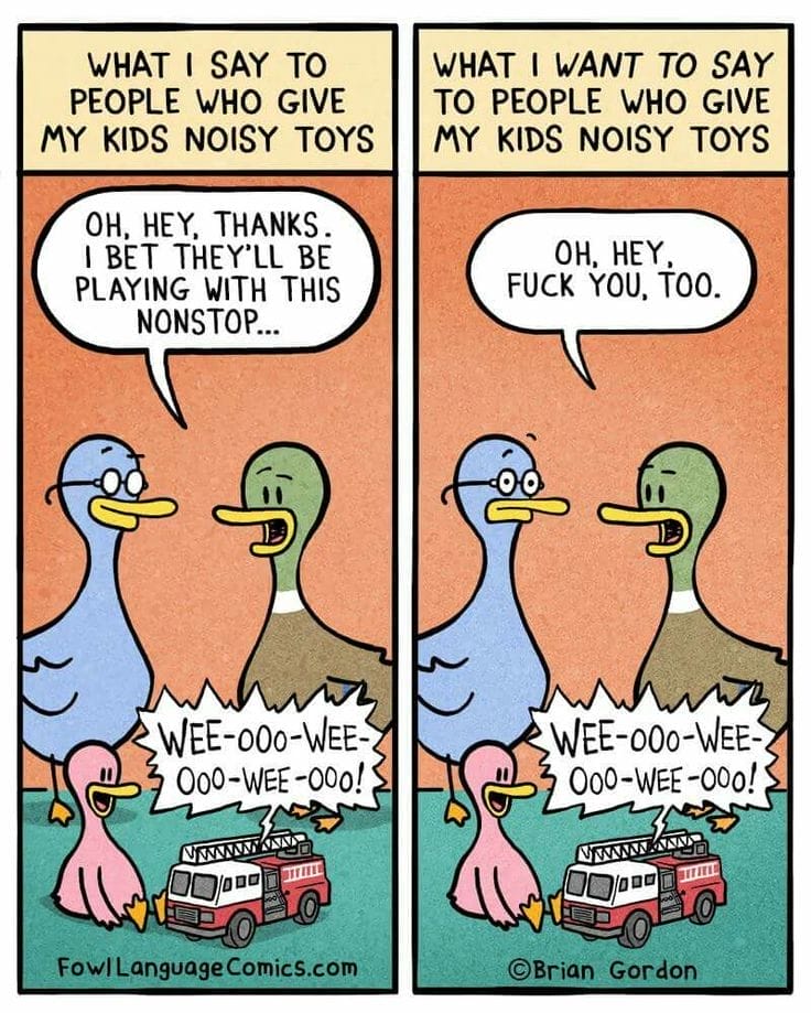 Someone gave your kid a noisy toy. Great. Now you’re stuck with sirens, buzzers, and wails 24/7. This comic cleverly contrasts what parents say (“Thanks!”) versus what they want to say. It’s a darkly funny nod to passive-aggressive gift-giving sabotage.