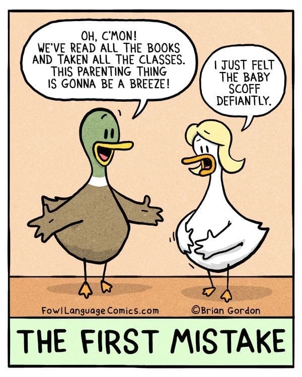Expecting parenting to be “a breeze” is the first sign you have no idea what’s coming. This comic delivers a genius punchline when the baby itself reacts skeptically from the womb. Yes, even babies know better.