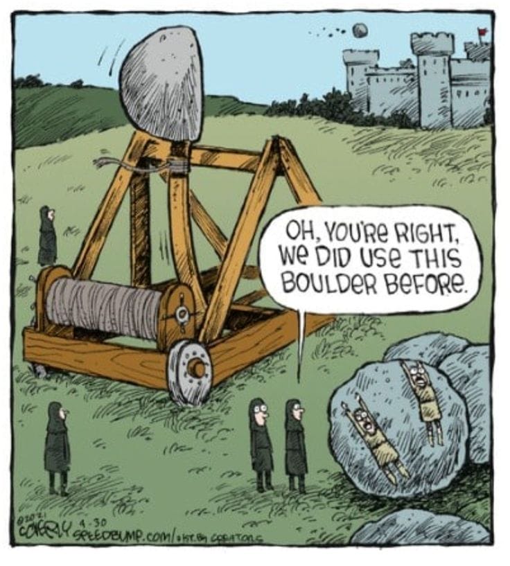 Siege warfare meets dry office humor: “We did use this boulder before.” Coverly’s ability to parody serious moments with mundane dialogue never misses the mark.