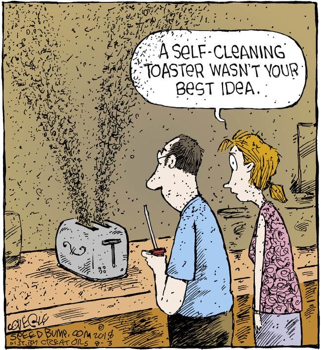 Who knew a toaster could go full auto-destruct? “Self-cleaning” becomes “self-incinerating” in this comic that captures every inventor’s worst fear—and spouse’s worst breakfast.