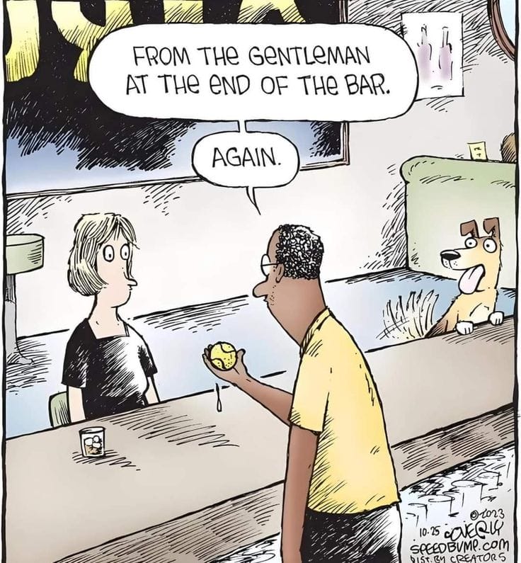 The “gentleman” at the bar keeps sending tennis balls. Yes, it’s a dog. And yes, it’s been trying to flirt. This clever gag mixes bar romance tropes with pet behavior—awkwardness well executed.